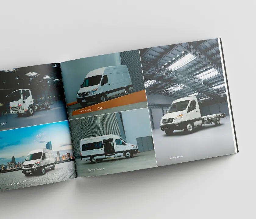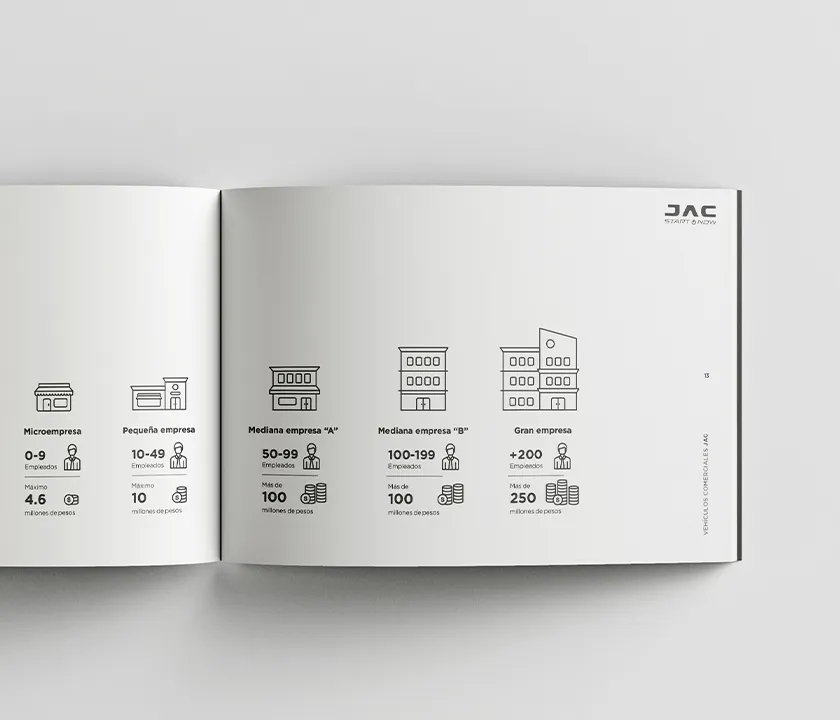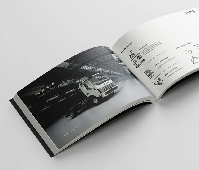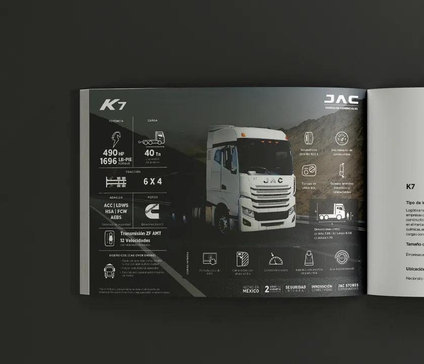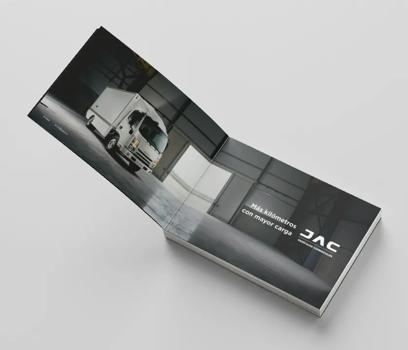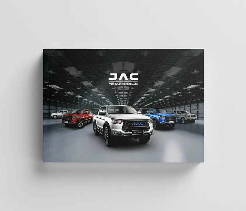 JAC es una marca que está transformando el sector automotriz al ofrecer diseño, seguridad y comodidad al alcance de todos. Como parte de su estrategia, necesitaban catálogos para su línea de vehículos comerciales que fueran funcionales, claros y visualmente coherentes con su identidad, pensados para acompañar y fortalecer el trabajo de su equipo de ventas.